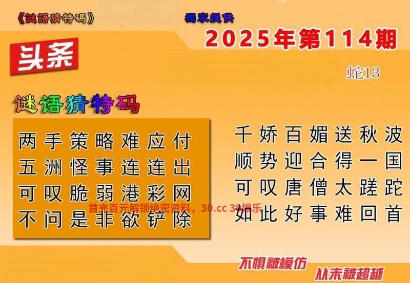 114期六合头条【解迷语猜特码】 两手策略难应付 五洲怪事连连出 可叹脆弱港彩网 不问是非欲铲除 解译:两手,两解双数,连连,连连双数 九肖:蛇马虎猴猪鼠牛鸡兔 |